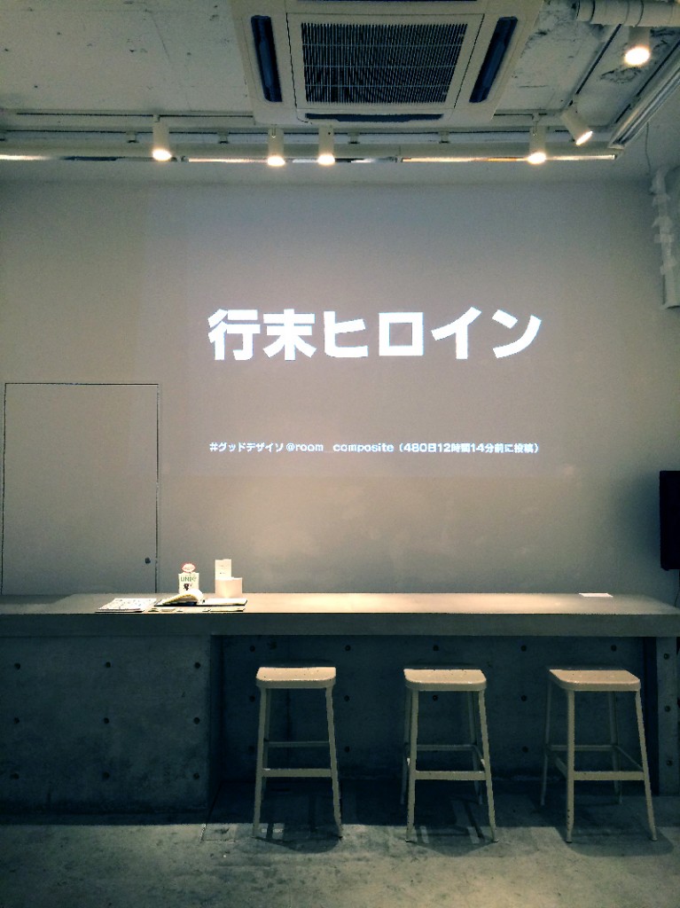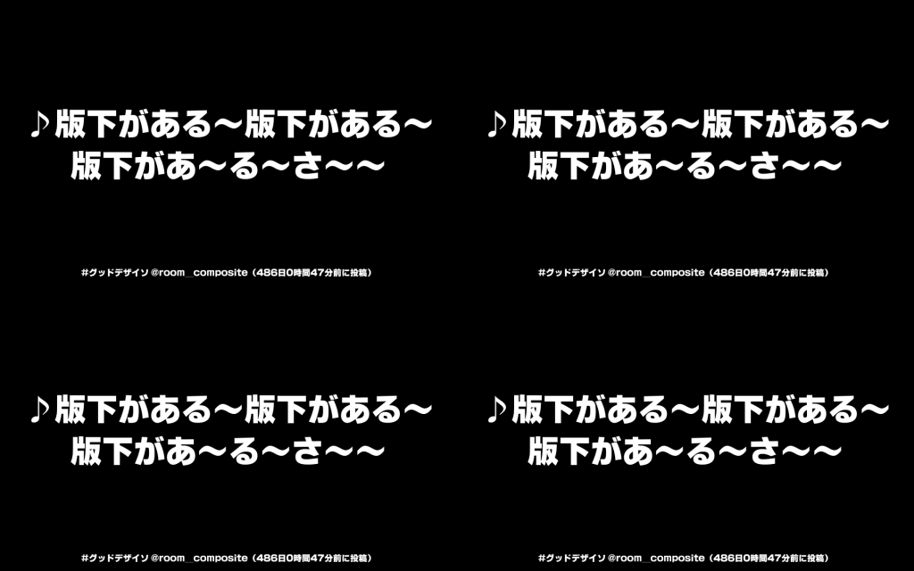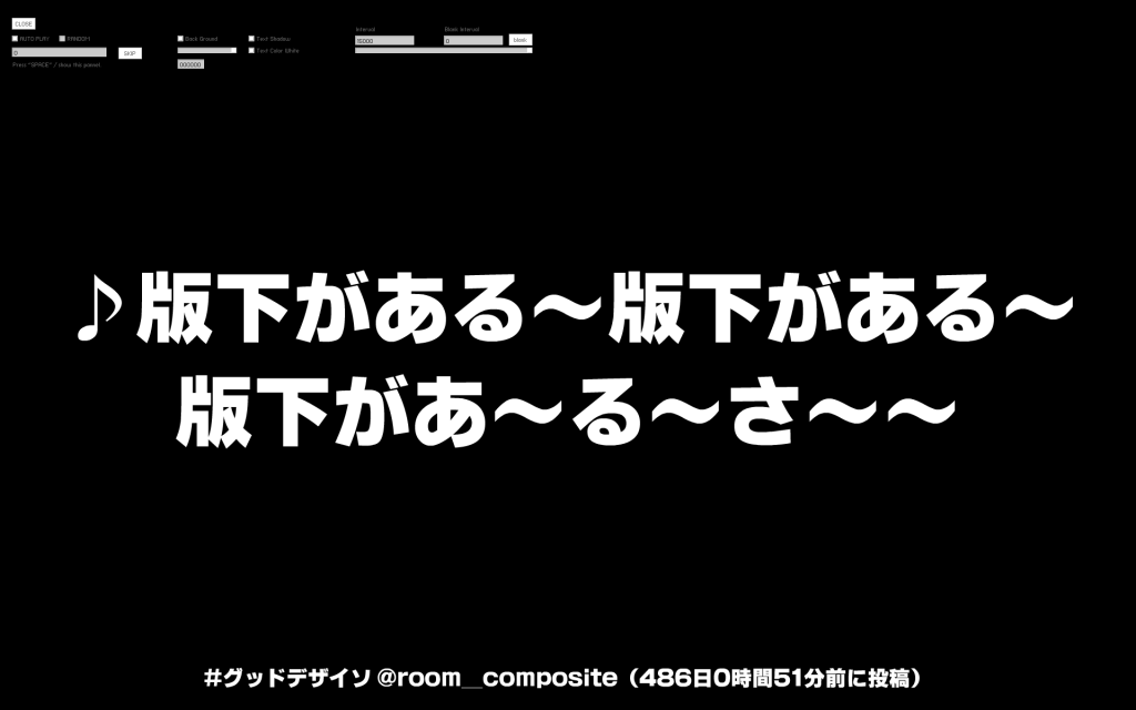 グッドデザイソのダジャレがイゲタ(#)の形に表示されるVJアプリです。フォントにはリョービの書体(ナウ)を使用しています。